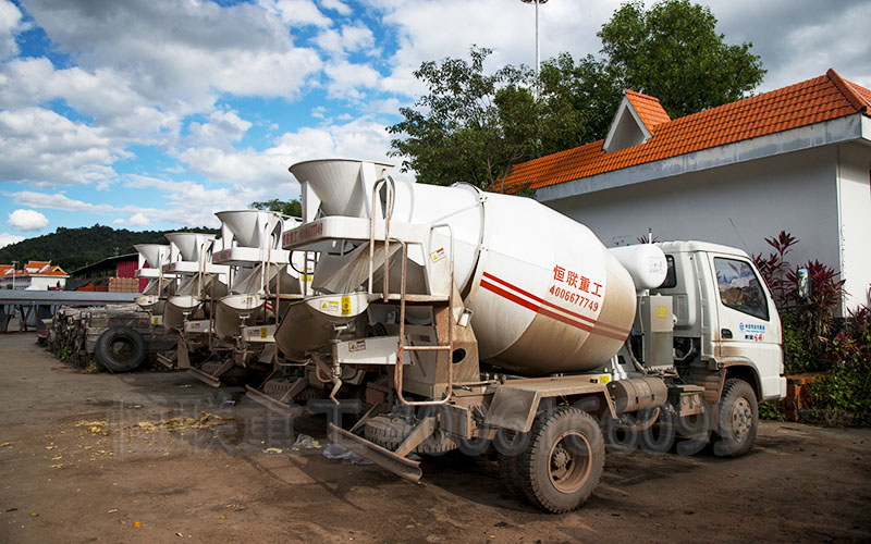 多臺2方攪拌車在云南西雙版納磨憨口岸等待過關(guān)出口